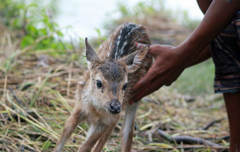 O destemido Belal, que é pré-adolescente, enfrentou uma forte enxurrada para salvar um pequeno filhote de veado, que corria o risco de se afogar.