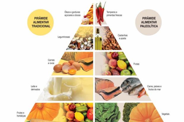 Veja abaixo a pirâmide da dieta paleolítica em comparação com a pirâmide balanceada.