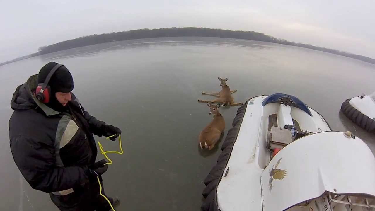 James viu um post no Facebook mostrando vários veados, presos no gelo, no meio do lago Albert Lea, em Minnesota, EUA.