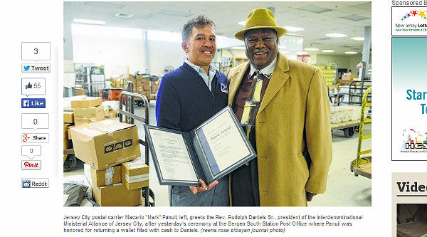 O caso de honestidade aconteceu em janeiro. Esta semana, como reconhecimento pelo seu gesto de honestidade, o carteiro Marcario Panuil foi promovido pelos correios de Jersey City.