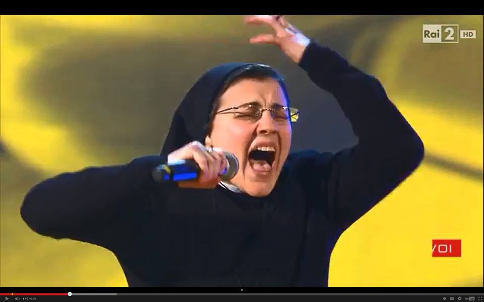 Vestida à caráter, com o hábito completo e crucifixo no peito, Cristina Scuccia arrasou na última quarta-feira cantando “No One”, de Alicia Keys.