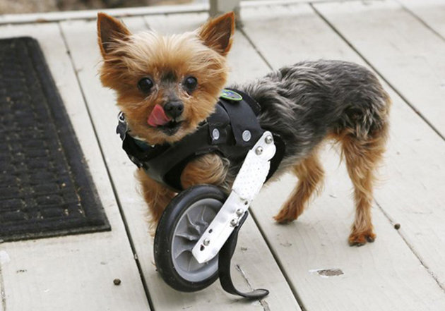O Yorkshire de nome Hope (foto acima) mostra sua ‘uni-roda’ que foi acoplada a um colete, e graças a essa ajuda, ele consegue andar tranquilamente pra todos os lugares.