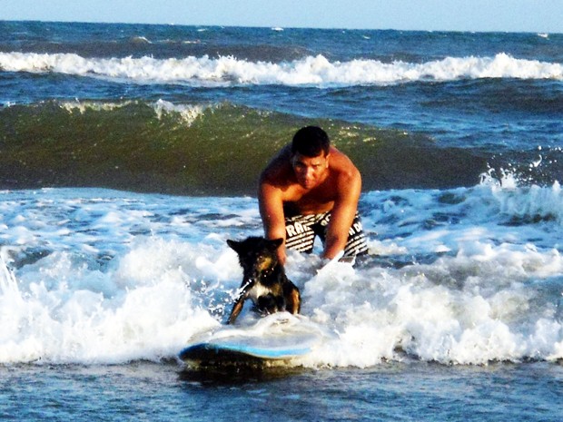 Isaque lembra que não foi difícil ensinar o cão, que hoje tem quatro anos, a surfar.