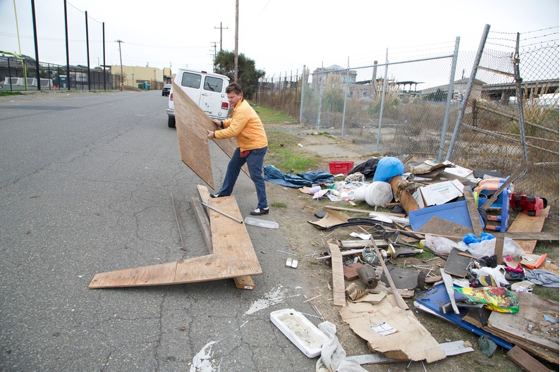 O material é recolhido do bairro industrial de Oakland, na Califórnia, conhecido como ponto de despejo ilegal de resíduos sólidos.