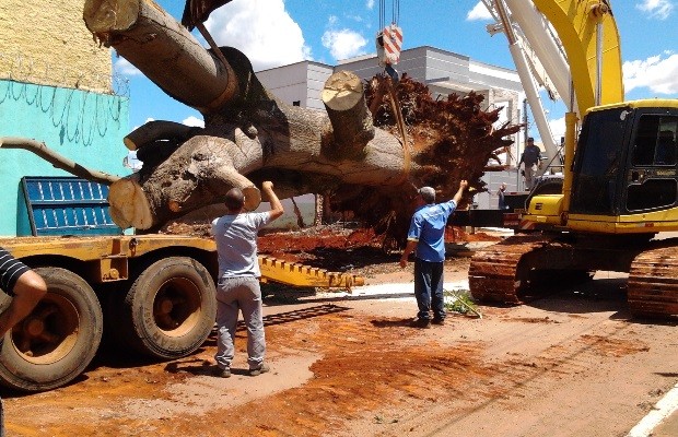 Com o trabalho de vários homens, carretas, retroescavadeira e até de um guindaste, a árvore foi içada e levada para uma região afastada da cidade, e replantada onde a prefeitura pretende fazer um bosque.