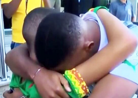 Durante o abraço o menino, emocionado, começou a chorar e o astro de Camarões não conseguiu conter as lágrimas também.