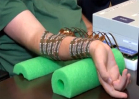 A informação é descodificada por um computador que, posteriormente, transmite os “comandos” a uma manga de eletrodos que foi colocada no braço de Ian para estimular os músculos.