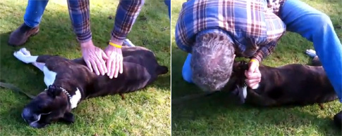 Ele pressiona o peito e faz massagens respiratórias cadenciadas no boxer, chamado Sugar.