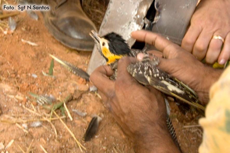 Tentando escapar da armadilha, por um buraco, o pássaro feriu o bico.