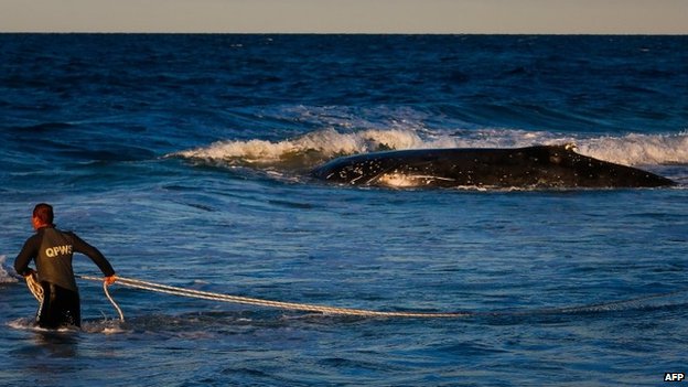 Na última quinta-feira, o grupo conseguiu colocar um cinto especial e rebocar a baleia para o mar.