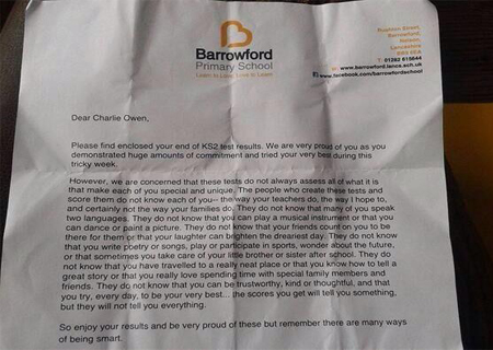 A carta da diretora Rachel Tomlinson foi junto com os testes nacionais e padronizados da Inglaterra, que medem a qualidade da educação, como o brasileiro Ideb, Índice de Desenvolvimento da Educação Básica.