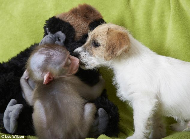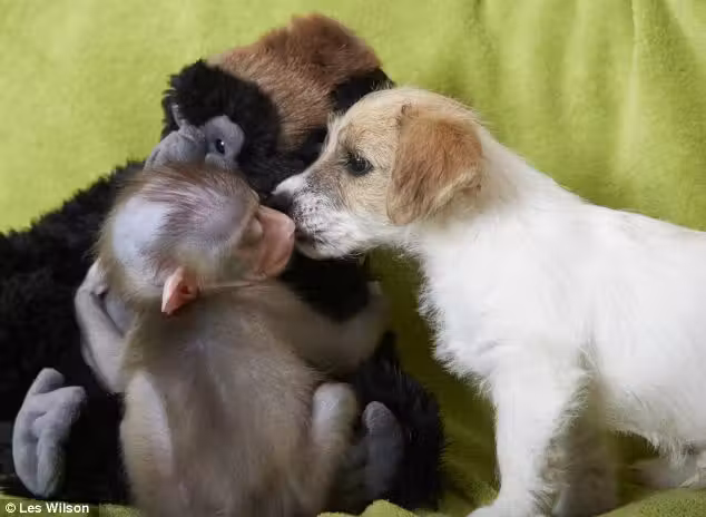 Um macaquinho da raça Broca Africano, que está em extinção, foi adotado por 2 cães.