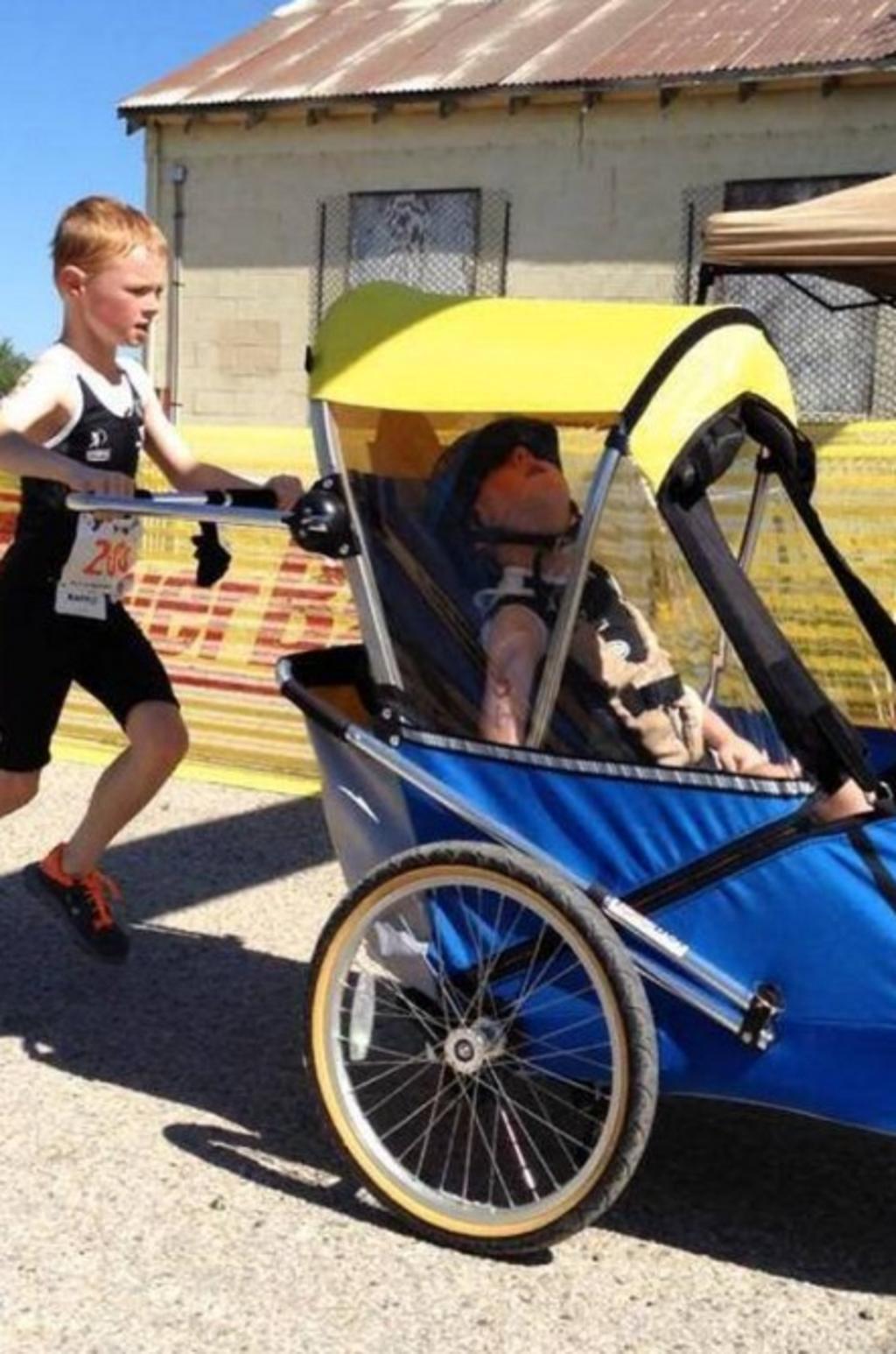 Noah se preparou durante três meses para as provas de natação, corrida e ciclismo e usou um carrinho, uma bicicleta e um pequeno bote adaptado para que Lucas pudesse acompanhá-lo.