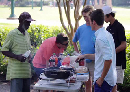 Enquanto uma parte do grupo preparava as carnes, dois amigos saíam pela rua para convidar pessoas simples, grande parte moradores de rua, para comer também.