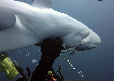 Durante o encontro Randy aplica um sedativo, gira suavemente o tubarão de cabeça para baixo, enquanto Cameron remove o gancho. (veja no primeiro vídeo abaixo)