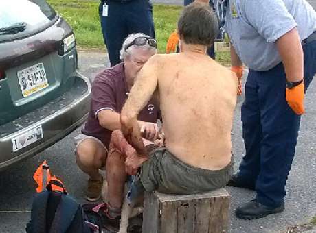 Coberto de sangue seu e do cachorro, Krichbaum conduziu o carro à procura de socorro e foi atendido em um mercado de frutas.