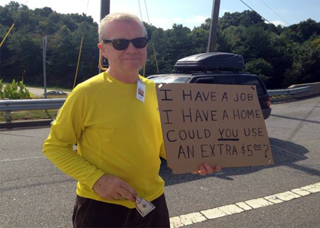 Por isso Bob carrega um cartaz (foto acima) que avisa: “Eu tenho emprego. Eu tenho um lar. Você quer 5 dólares?”.