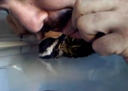 Rapaz salva pássaro afogado: respiração boca-a-bico