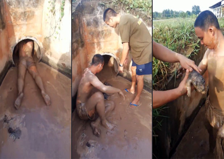 Apenas de short, o jovem desliza de barriga pra baixo esgoto à dentro e pega os bichinhos.