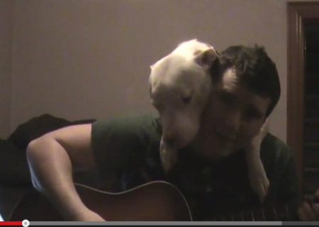 O cão, um pitbull, abraça o dono enquanto ele toca violão.