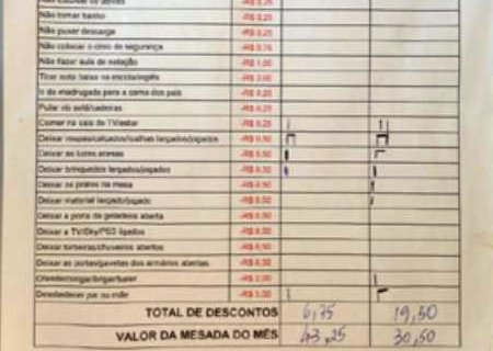 Ele desrespeitando 11 itens da lista – alguns mais de uma vez – e teve descontados R$ 19,50 do valor total da mesada (R$ 50).