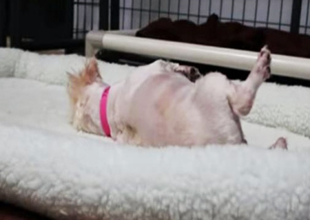 Ela é colocada em uma caminha confortável e parece não acreditar no que está acontecendo.