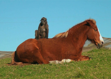 O macaco faz o que quer com o cavalo: brinca com ele, faz carinho, tira parasitas do pelo e monta no cavalo.