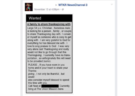 Neal Shytles, um sem-teto de 54 anos, postou um anúncio nas páginas do Facebook de emissoras de tv de sua cidade natal, Virginia Beach, pedindo alguém para convidá-lo para o jantar de Ação de Graças.