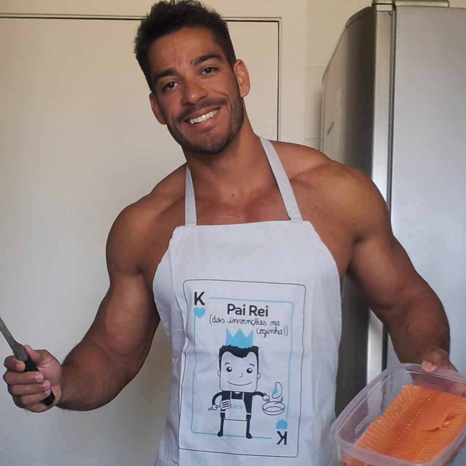 Rodrigo Barreto também grava vídeos de avental, ensinando como fazer pratos saudáveis.