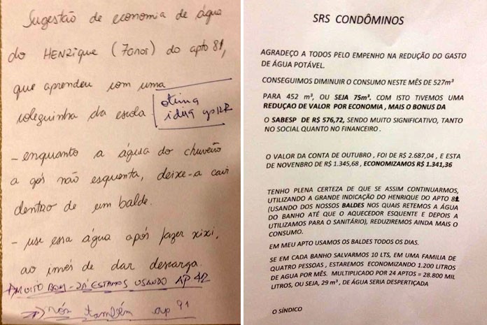Um comunicado do síndico divulgado no início de dezembro apontou que o prédio recebeu bônus de R$ 576,72 e economizou R$ 1.341,36 na conta da Companhia de Saneamento Básico do Estado de São Paulo (Sabesp).