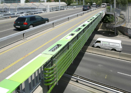 Num protótipo construído numa movimentada rodovia de Genebra, na Suiça, no início deste ano, os arquitetos do The Collective Nuvem testaram um sistema de cultivo de algas em tubos na parede do viaduto.