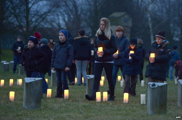 No Muro da Morte, onde os prisioneiros foram executados foram acesas velas, pequenos pontos de luz nesta paisagem de neve, que faz a Europa lembrar de um tempo de trevas.