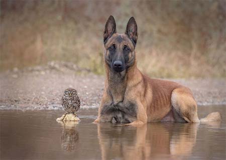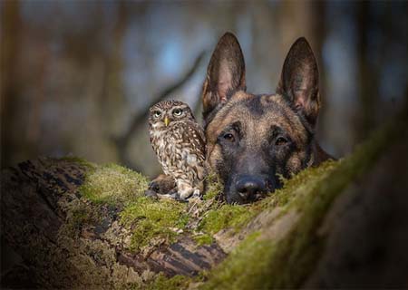 A fotógrafa de animais Tanja Brandt registrou lindos momentos de interação e amizade entre um cachorro pastor alemão e uma coruja.