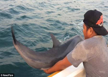 Um dos homens pegou o bebê golfinho nos braços como se fosse uma criança e foi para o barco.