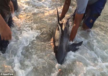 Moradores locais tentaram empurrar o golfinho para o mar várias vezes, mas as ondas sempre o traziam de volta.