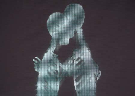 Atrás da tela sai um casal de mulheres, que trocam mais um beijo no palco.
