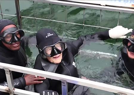 Aos 100 anos, além de ficar cara a cara com os animais perigosos, a bisavó centenária também enfrentou as águas geladas da África do Sul.