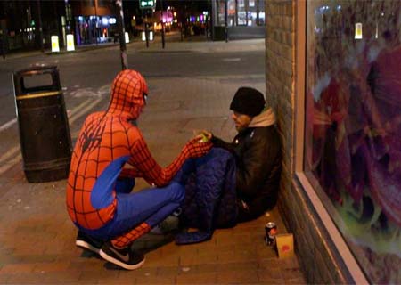 Homem-aranha alimenta pobres nas ruas