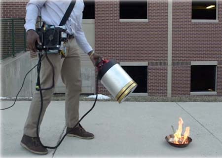 O extintor combate o fogo com ondas sonoras de baixa frequência na faixa de 30 a 60 hertz.