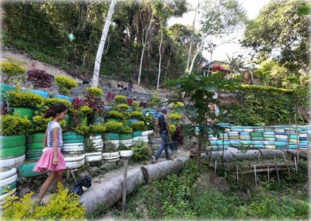 No centro do parque foi erguida uma muralha de 386 pneus e 23 toneladas, que ajuda a conter a água das chuvas, temida por provocar deslizamentos de terra, e que foi pensada também para ser um ponto de encontro dos moradores e palco de atividades culturais.