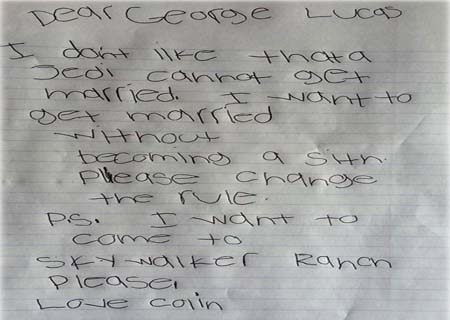 Além de livros e fotos de George Lucas e Star Wars, a LucasFilm enviou uma resposta totalmente personalizada ao pedido de Colin: