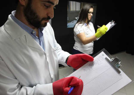 Vestindo uma luva de borracha grossa, o participante também precisou escrever o seu nome em uma lista de presença.