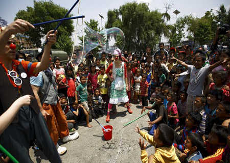 Além de trabalharem no hospital de campanha, os palhaços estão visitando as comunidades em algumas das áreas em Nepal mais atingida pelo terremoto.
