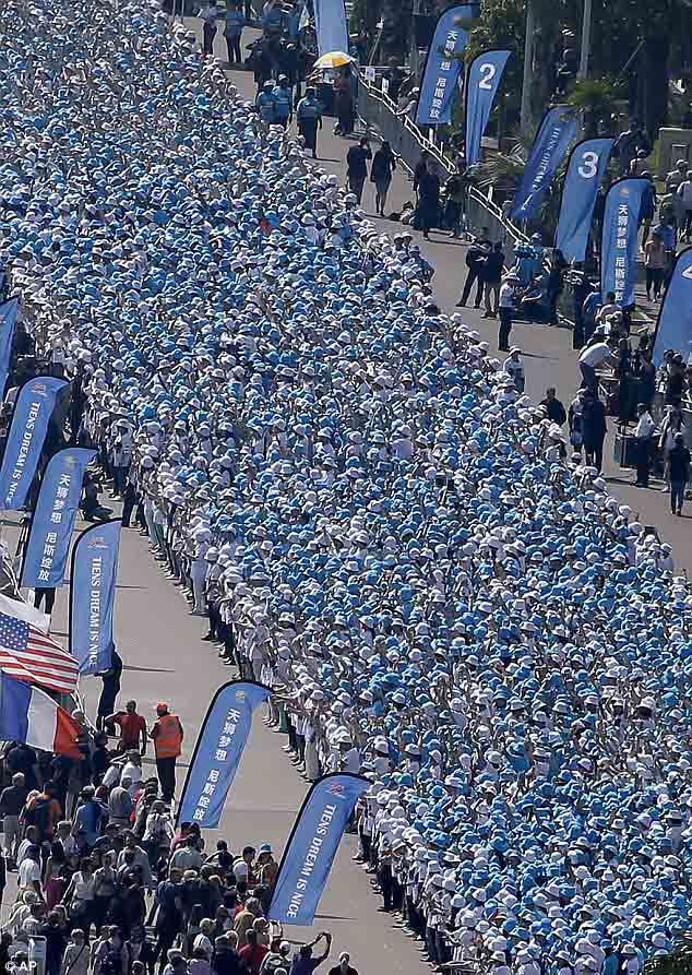 Os 6.400 funcionários se organizaram para formar a frase ” O sonho da Tiens é Nice na Cote d’Azur “, para comemorar os 20 anos de parceria entre a empresa chinesa e a região francesa.
