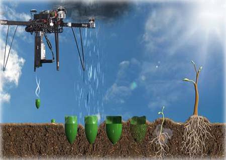 Ao encontrar um local adequado, as máquinas voam a uma altura de dois a três metros do chão e, então, liberam cápsulas com sementes pré-germinadas cobertas com um hidrogel nutritivo.
