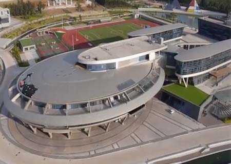Imagens feitas com drones mostram um edifício convencional visto de lado, mas à medida que a câmera se aproxima, vem a surpresa.