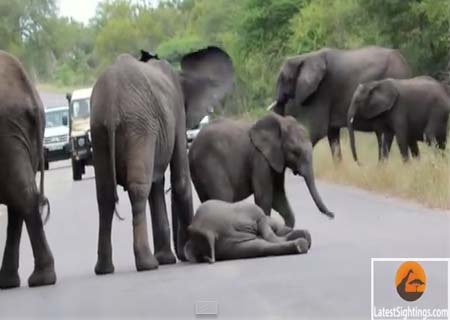 Elefantes ajudam filhote caído no meio da estrada