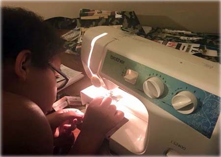 Ele ganhou recentemente uma máquina de costura, vinda de uma generosa doação.