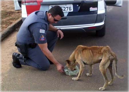A foto de um policial militar alimentando um cachorro de rua, bem magrinho e doente, causou comoção ao ser postada no Facebook.