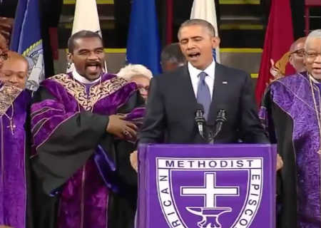 Durante uma cerimônia em Charleston, EUA, em homenagem aos 9 mortos no ataque a uma igreja metodista, em vez de discursos, Barack Obama cantou um hino em protesto contra o racismo.